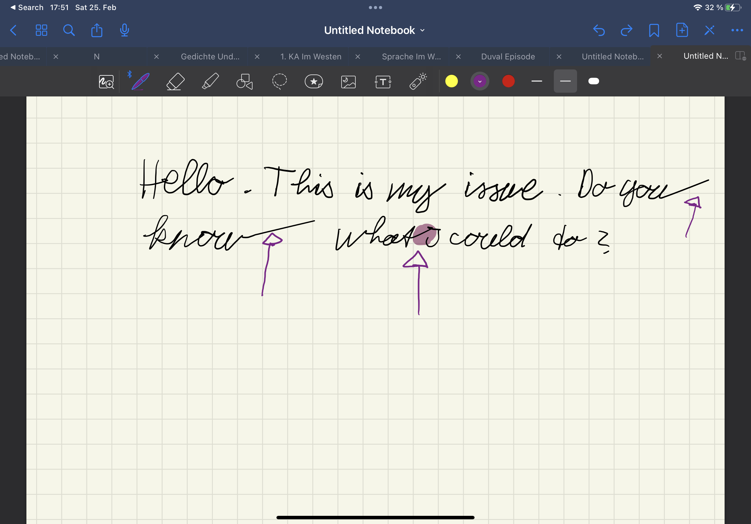 Hello, I hope somebody could help me with the following issue I have to deal with. I have bought an Ipad 11 (2022) just one week ago. While writing and working in 'good notes' or 'notability'. I noticed that the apple pencil automatically adds lines to the word I have just written down or connects words next to each other without me doing anything. It just adds these lines while I am in the middle of writing something down. Additionally, the lines of which a word consists are sometimes extended and get much longer than I intended to. In the attached picture you can understand what my issue is. Ignore my bad scripture I am getting used to the Ipad ^^ Thank you!