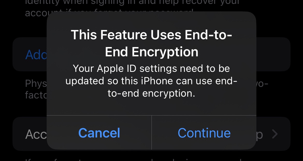 when I try to update the security settings in Apple ID settings I get the below pop up. I can’t set up legacy contact, account recovery, nada when I click continue it logs me in then nothing