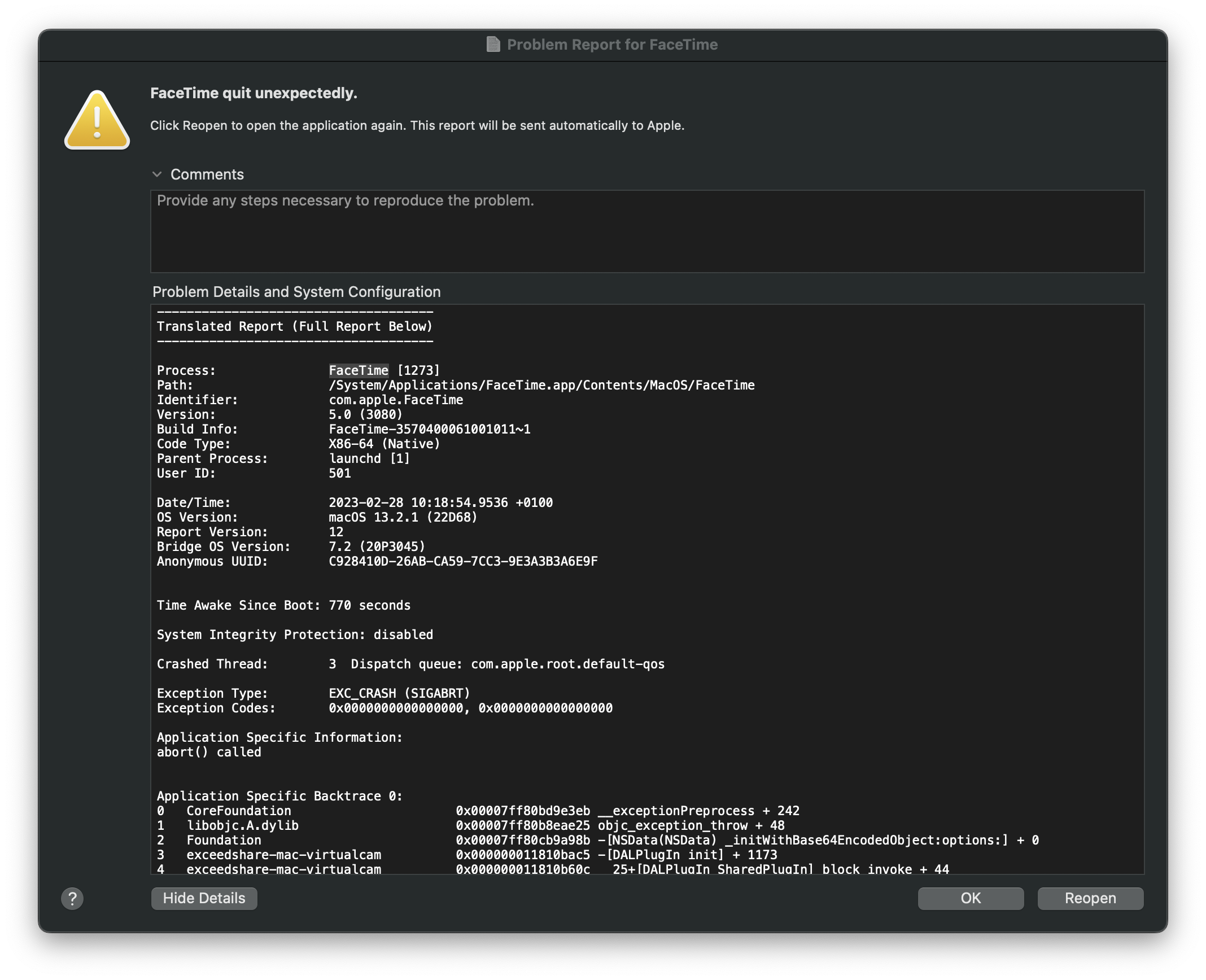 FaceTime cannot start, keeps crashing EXC_CRASH (SIGABRT)