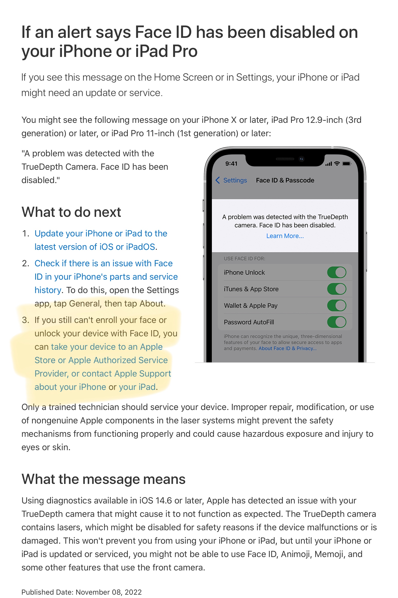 My iPhone true depth camera is showing disabled