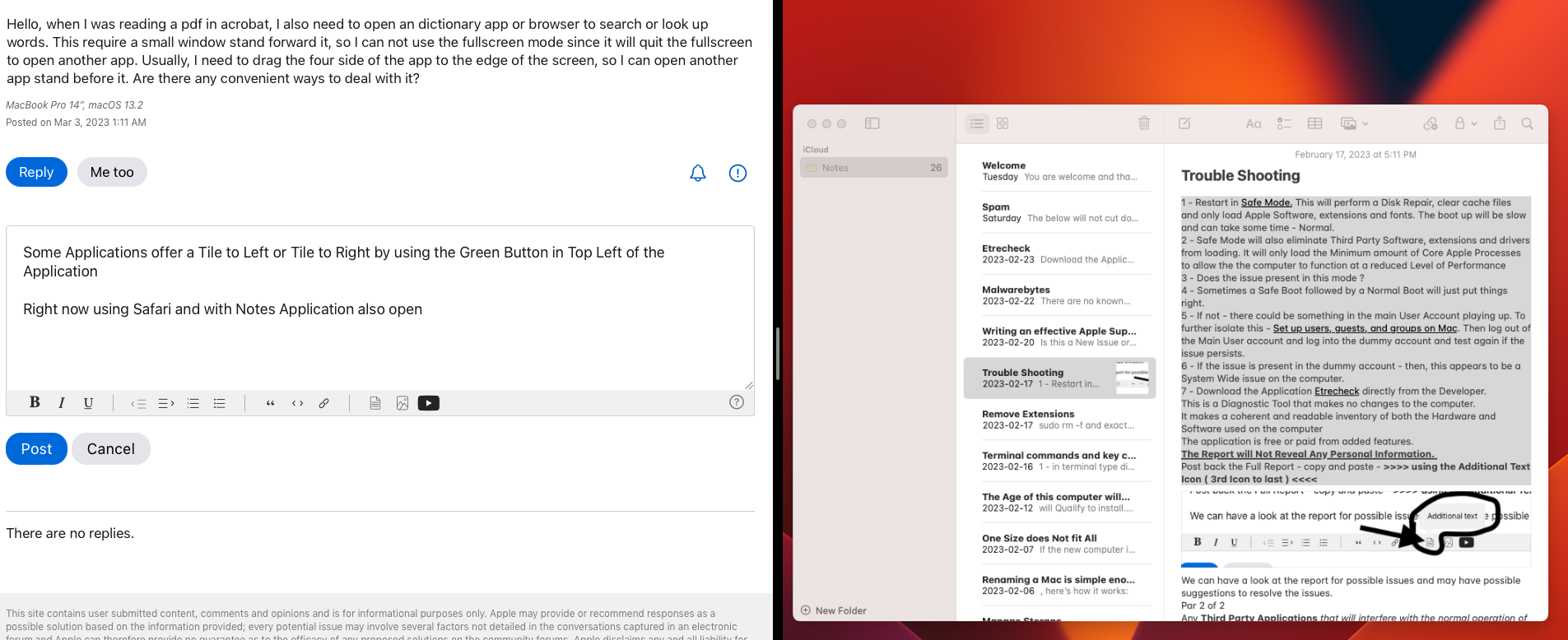 Hello, when I was reading a pdf in acrobat, I also need to open an dictionary app or browser to search or look up words. This require a small window stand forward it, so I can not use the fullscreen mode since it will quit the fullscreen to open another app. Usually, I need to drag the four side of the app to the edge of the screen, so I can open another app stand before it. Are there any convenient ways to deal with it?