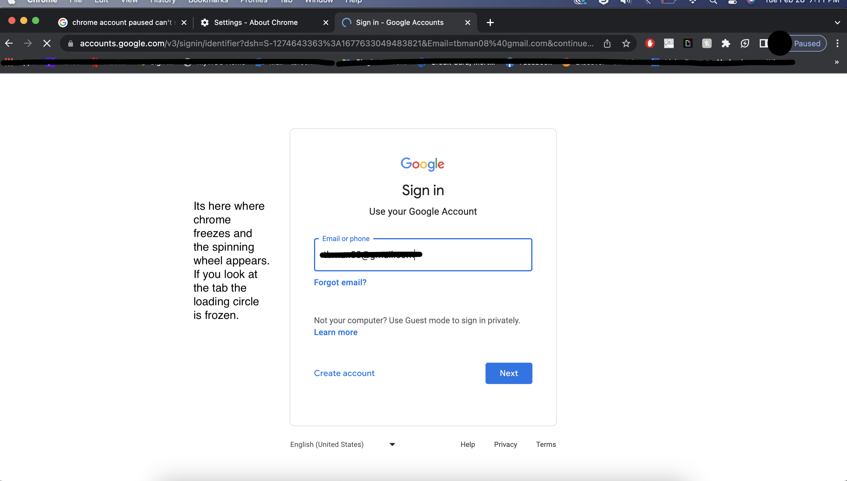 Recently as of about a month ago (I'm assuming. I don't really use my mac as much anymore) My google account has been "paused" and every time I try to sign back in to resume sync, It takes me to the google account sign in page which is when chrome freezes and the beloved spinning wheel appears. I have to force quit chrome to get out of it.