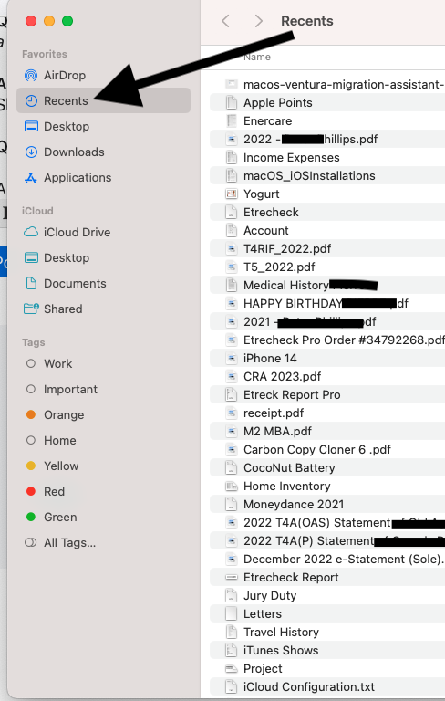 Unless I have inadvertently reconfigured something, which is always a possibility. Shortly after my first time machine backup, I erased my disk to take all my display settings to factory state. After I started again from scratch, I used time machine to restore my applications. Thank G that worked like a charm although I did it one app at a time because I didn't know how to do it all at once. Then I tried to restore recents and at the top it said searching recents. But nothing happened. And after waiting for about 5 hours as I worked on other things with a second computer I gave up . Nothing had apparently changed. As for Documents, Downloads etc. all the other sidebar items were grayed out. unavailable for restore.