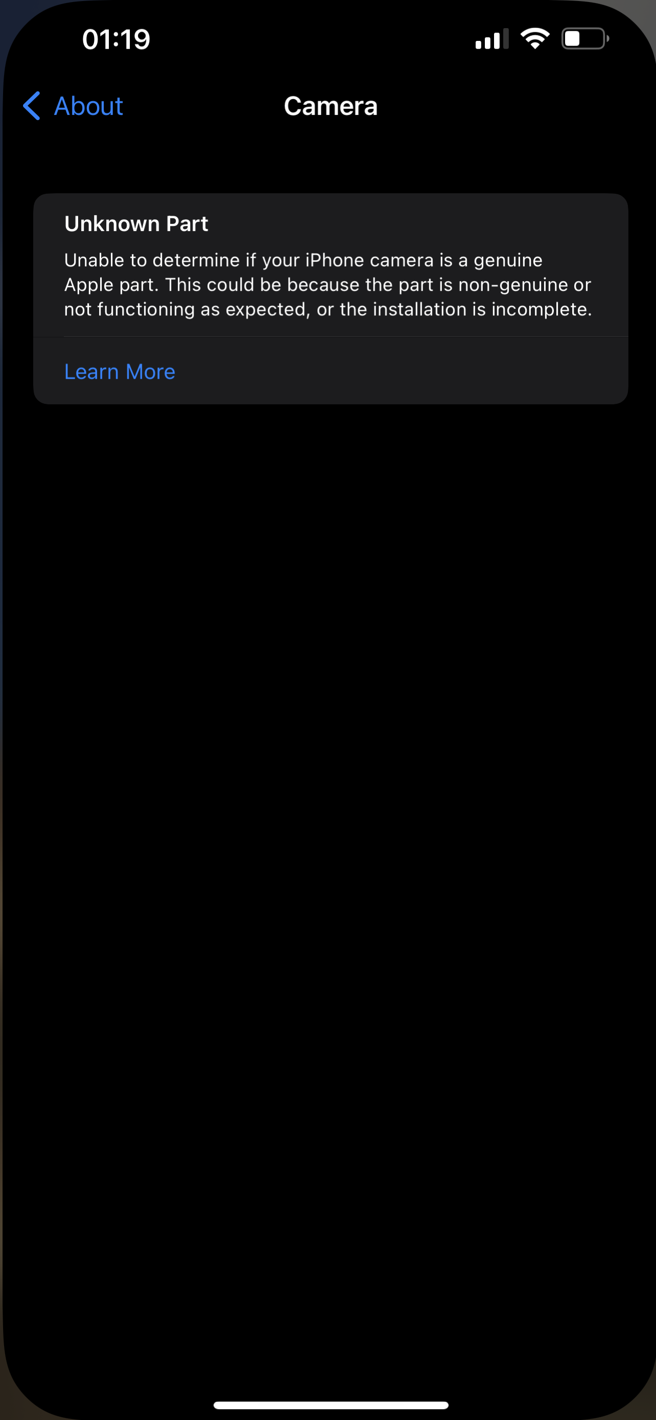 I was on a trip and casually taking pictures and my phone froze so I thought my storage was full and then I deleted some pictures and restart my phone. As soon as I was done restarting there was a notification saying “Important camera message” then I clicked on it and it says “Unable to determine if your iPhone camera is a genuine Apple part” umm it hasn’t even been a year since I use this iPhone 13 pro max … Please help me because I love taking photos using the wide angle lens its cuteee !! and I don’t have the option anymore :(