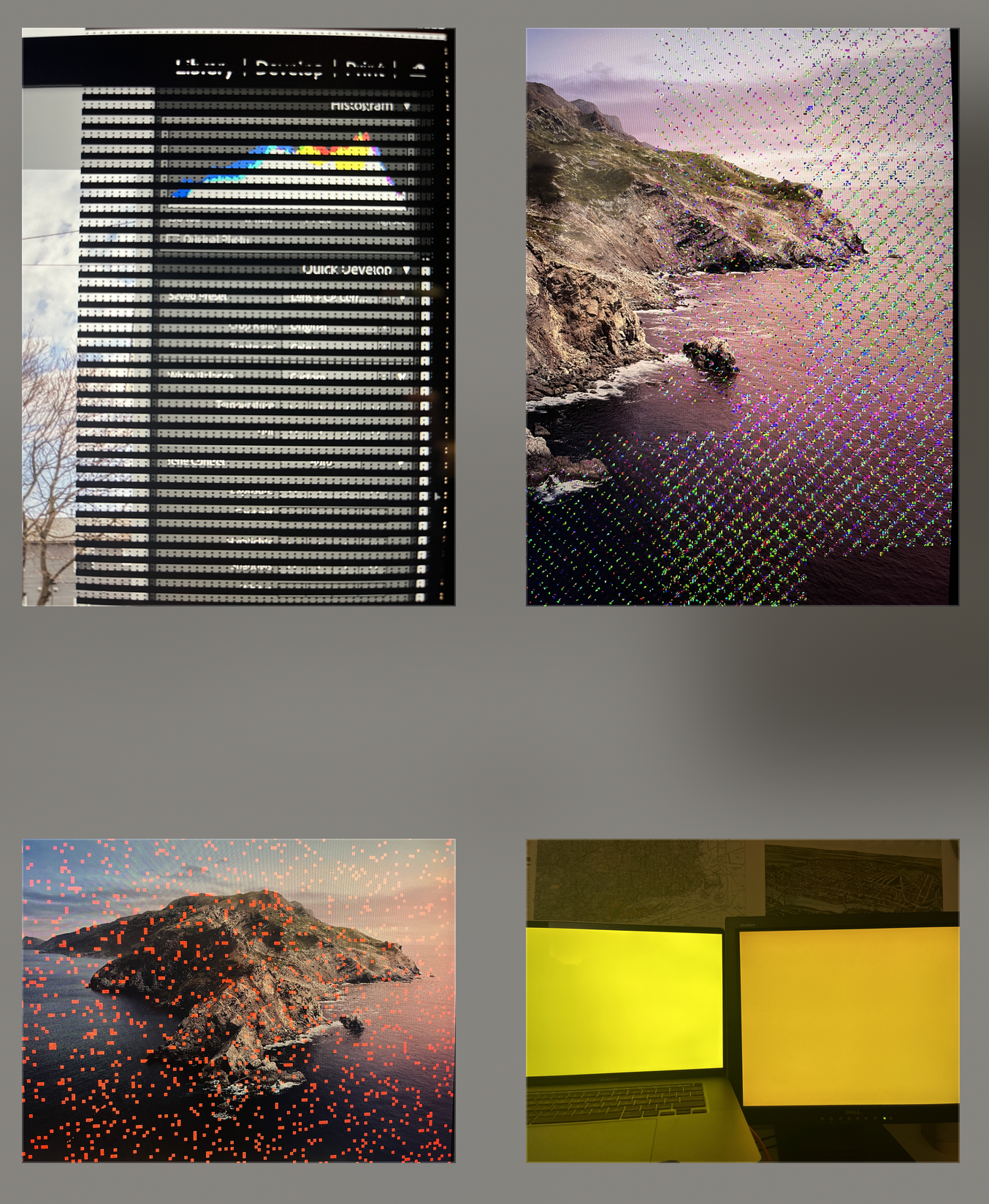 I was editing in Adobe Lightroom Classic with Photoshop in the background. I went to click something and accidentally opened a slew of minimized Safari windows and completely locked up the computer. It crashed. This machine rarely crashes so I was surprised. I turned it back on and it didn't boot normally. At first the external monitor turned a solid yellow. Then it went black and the laptop screen turned a solid yellow. It got stuck there for a while. Then a small glitch appeared in the upper right corner of the laptop screen. Many other visual glitches occurred (red boxes scattered all over the screen, single pixel black dots scattered across the screen, checkerboard patterns, random areas blacked out etc.) Additionally it was very slow or unresponsive especially upon first boot when it attempted to open all the previous programs. I turned that option off and restarted without any programs being restored from the previous session.