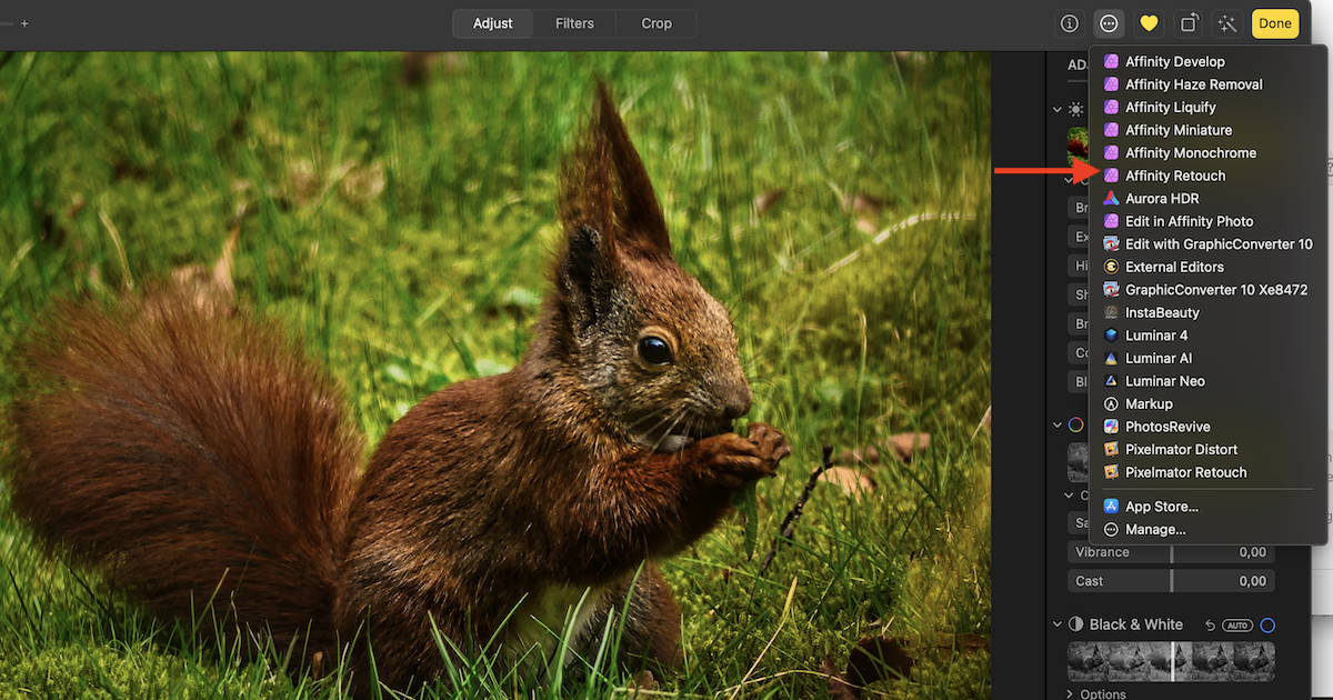 Or from the Edit mode - this will launch selected extensions. I prefer to use Affinity like this, as I do not have to bother with the Personae, and can go straight for Retouch or Haze Removal: