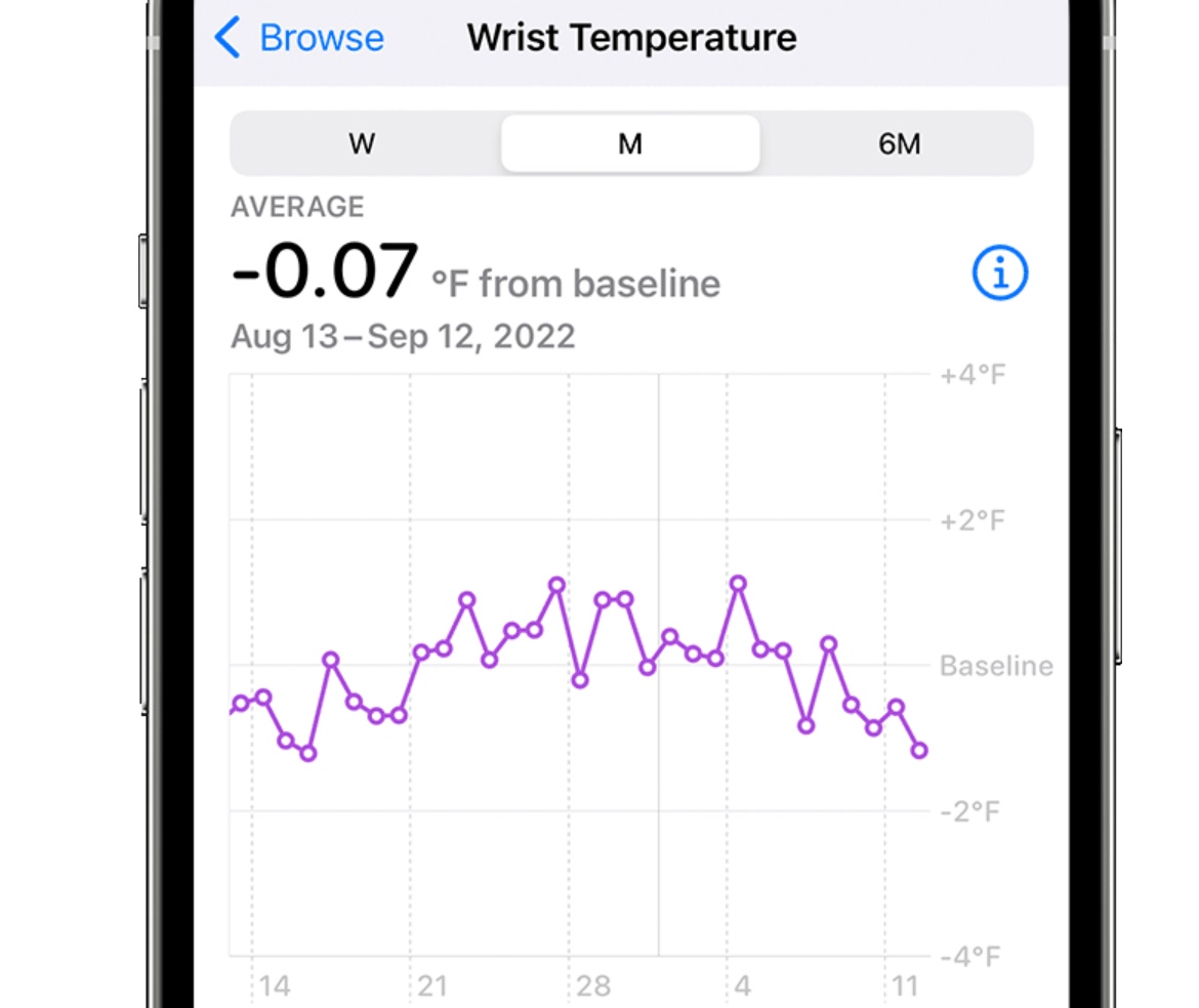 Temperature sensing. An innovative temperature sensor9 enables groundbreaking insights for women’s health and advanced cycle tracking.10 And it records overnight temperature changes, which you can see in the Health app.