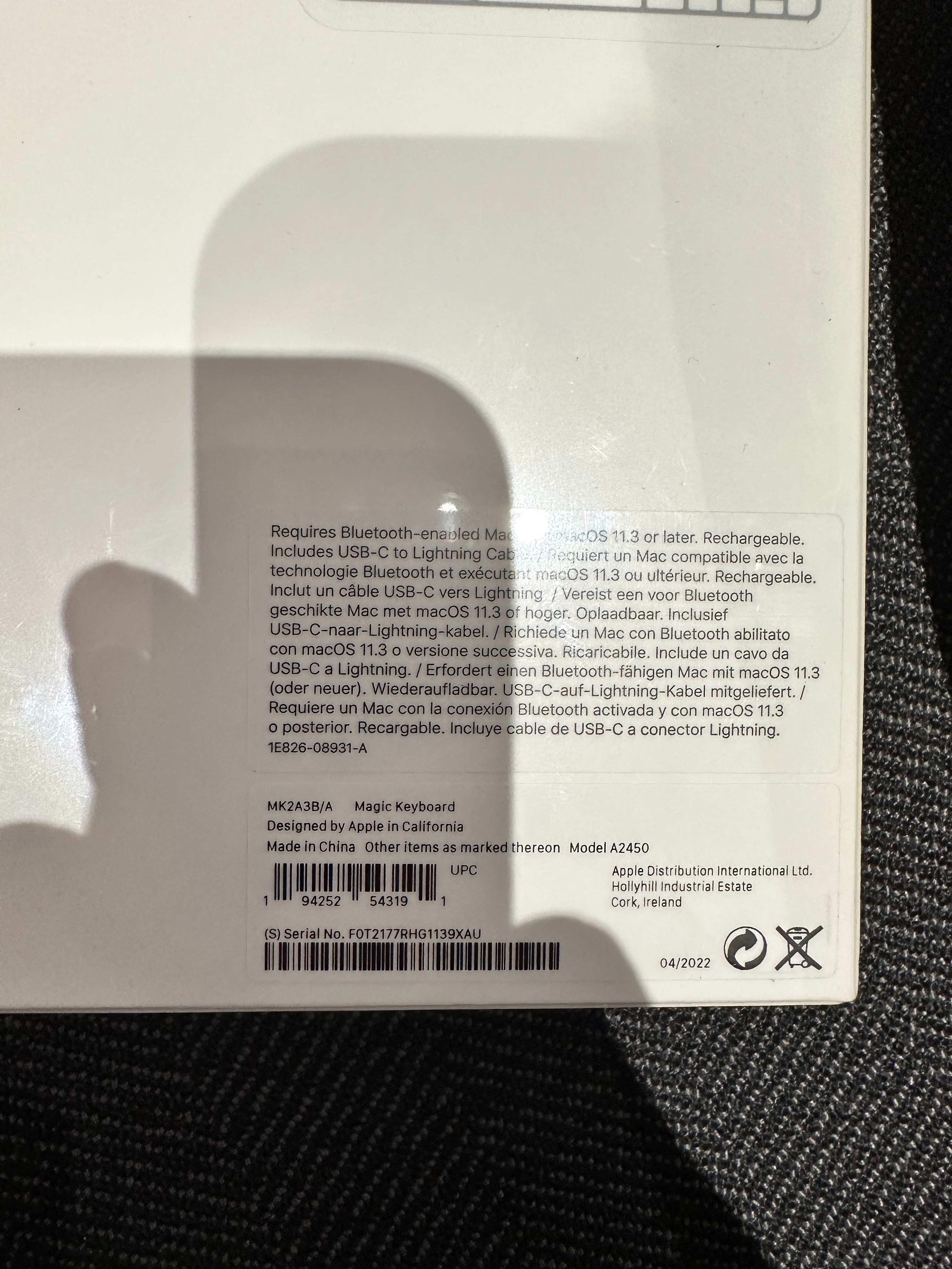 I want to gift this brand new Magic Keyboard to a friend but unfortunately forget if it's American English or British English.