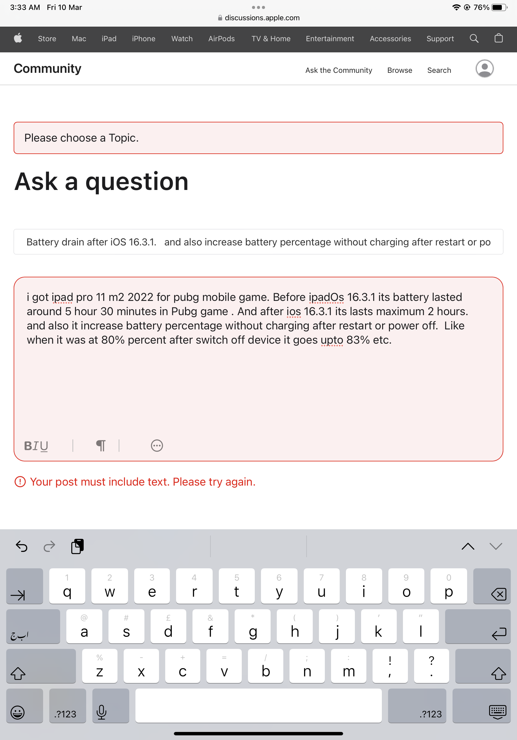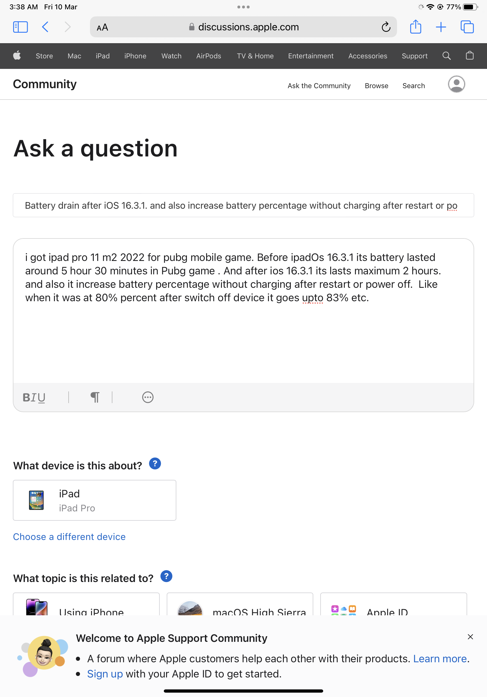 i got ipad pro 11 m2 2022 for pubg mobile game. Before ipadOs 16.3.1 its battery lasted around 5 hour 30 minutes in Pubg game . And after ios 16.3.1 its lasts maximum 2 hours. and also it increase battery percentage without charging after restart or power off. Like when it was at 80% percent after switch off device it goes upto 83% etc. here is my screenshot you can can clearly watch the battery percentage increase without charging after restarting device. Kindly help me thanks