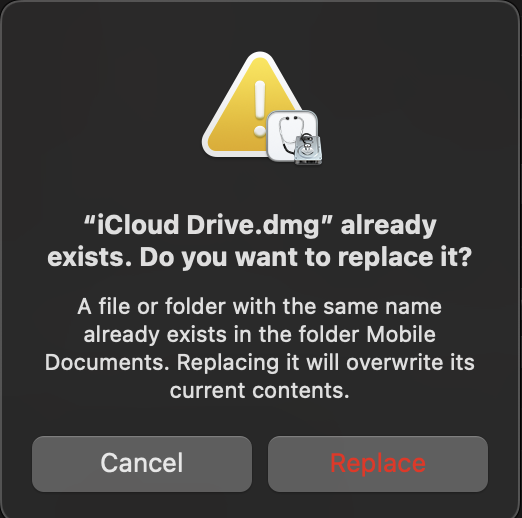 I tried to do the same thing again with the exact same procedure of creating disk image with name iCloud Drive.dmg in iCloud with AED-256 bit and read-write permission. When I clicked on save, it was shown that a file names iCloud Drive.dmg already exists in this folder called "mobile documents".