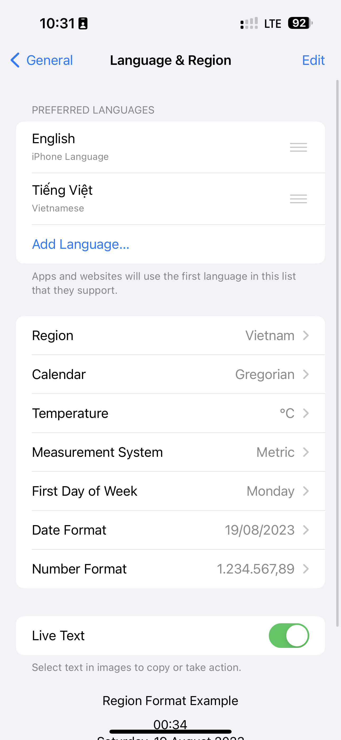 I have Language and Region mirrored my iPhone, which is set to English, then Vietnamese, by this order