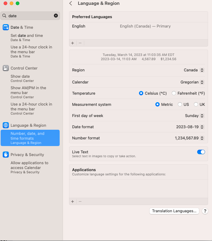 The the Pop down search will bring up " Language " >> " Numbers date and Time Format "