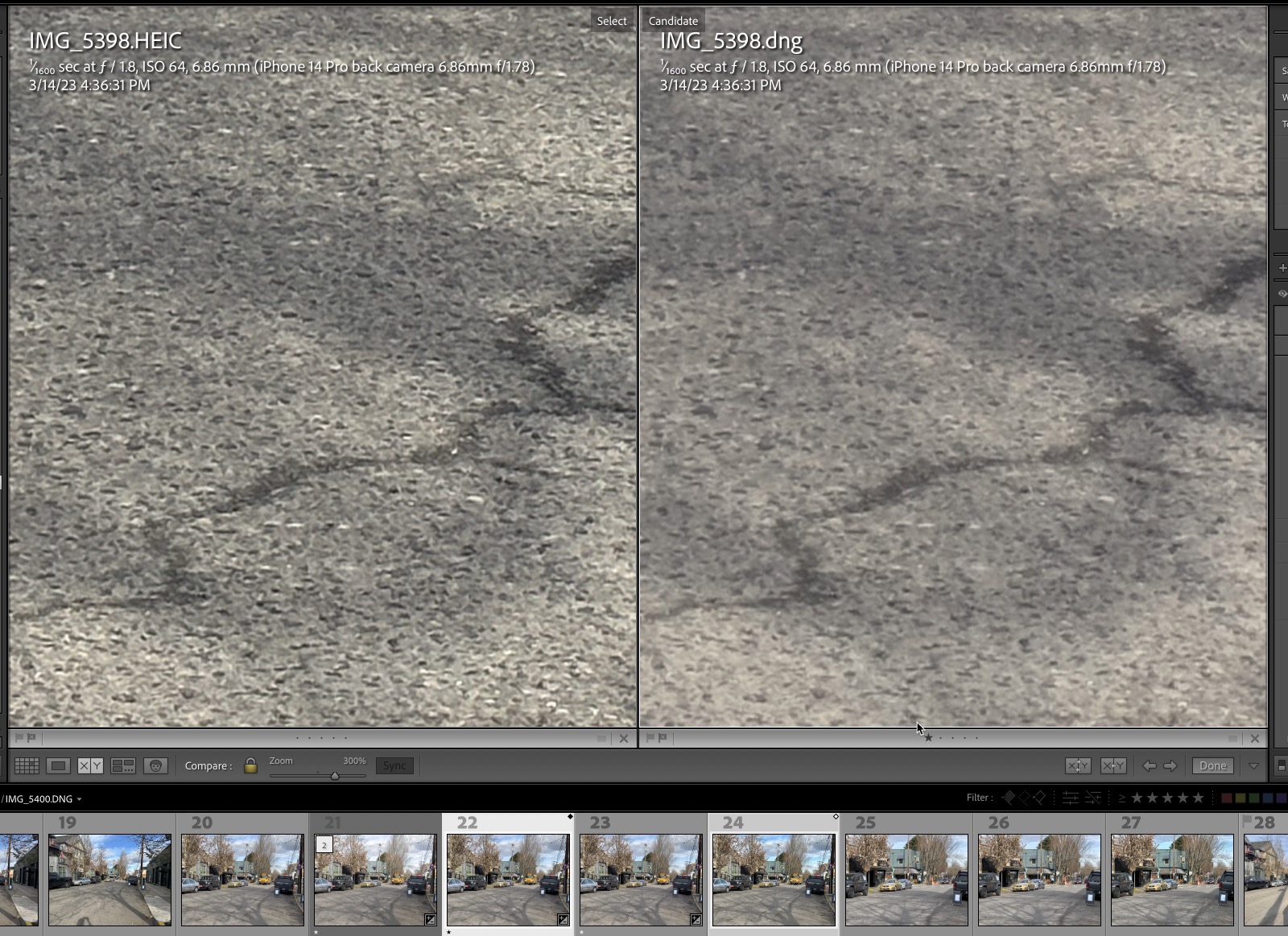 I am getting ready for a short trip to Europe and purchased a iPhone 14 with the idea that it would be my only camera I would use on the trip. Did some test shots and used Adobe Enhance as well as Topaz Gigapixel/Photo AI to upsize the 12mpx DNG files from the iPhone and was shocked at the results. (pictures attached). Then I compared an iPhone HEIC file to a DNG file and it is my opinion that either Apple is sending muddy ProRes DNG files out of the camera or Adobe does not know how to do the conversion of Apple's ProRes format. Posted this comment on Adobe as well. Really irritated as I do not think it is an issue with the iPhone but with Apple's ProRaw format. Moved files two ways, one through iPhoto and the other by copying the files directly to the cloud. Any idea what happens in LR cloud? Again, really irritating and having a hard time deciding if I should even take pictures with the iPhone if this is the quality of ProRaw images I will have to work with.