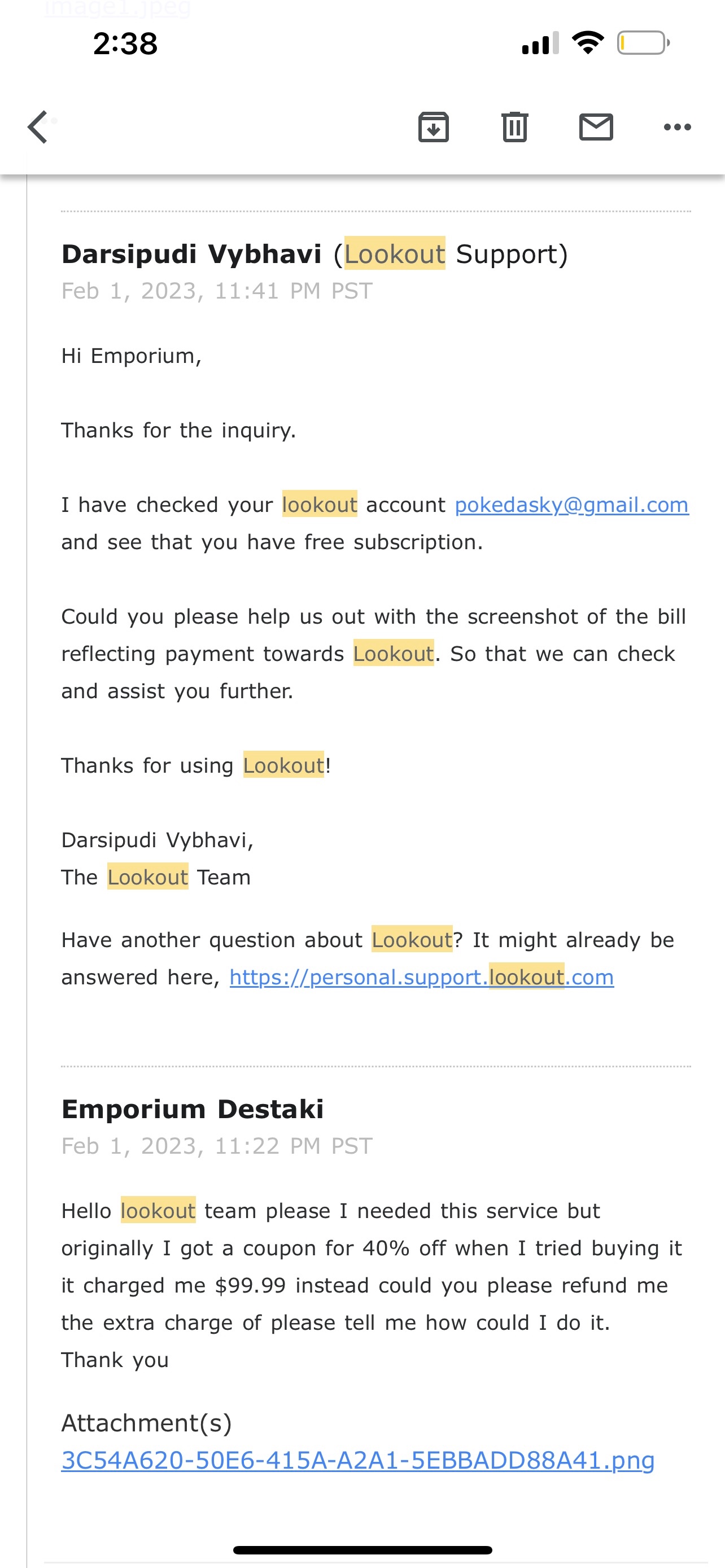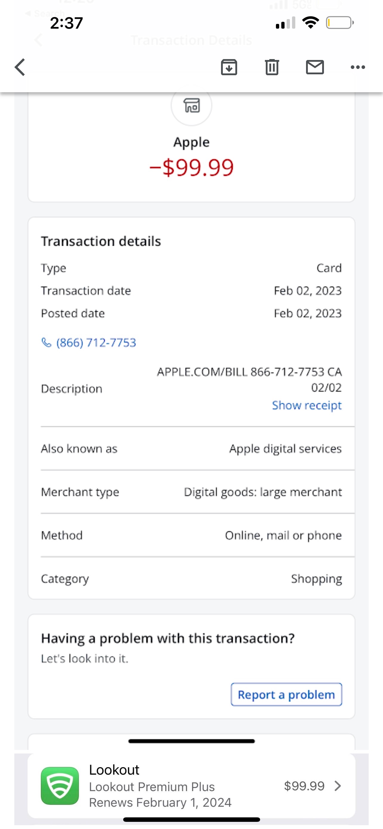 I have a purchase in Lookout APP I was offered the service for $59,99