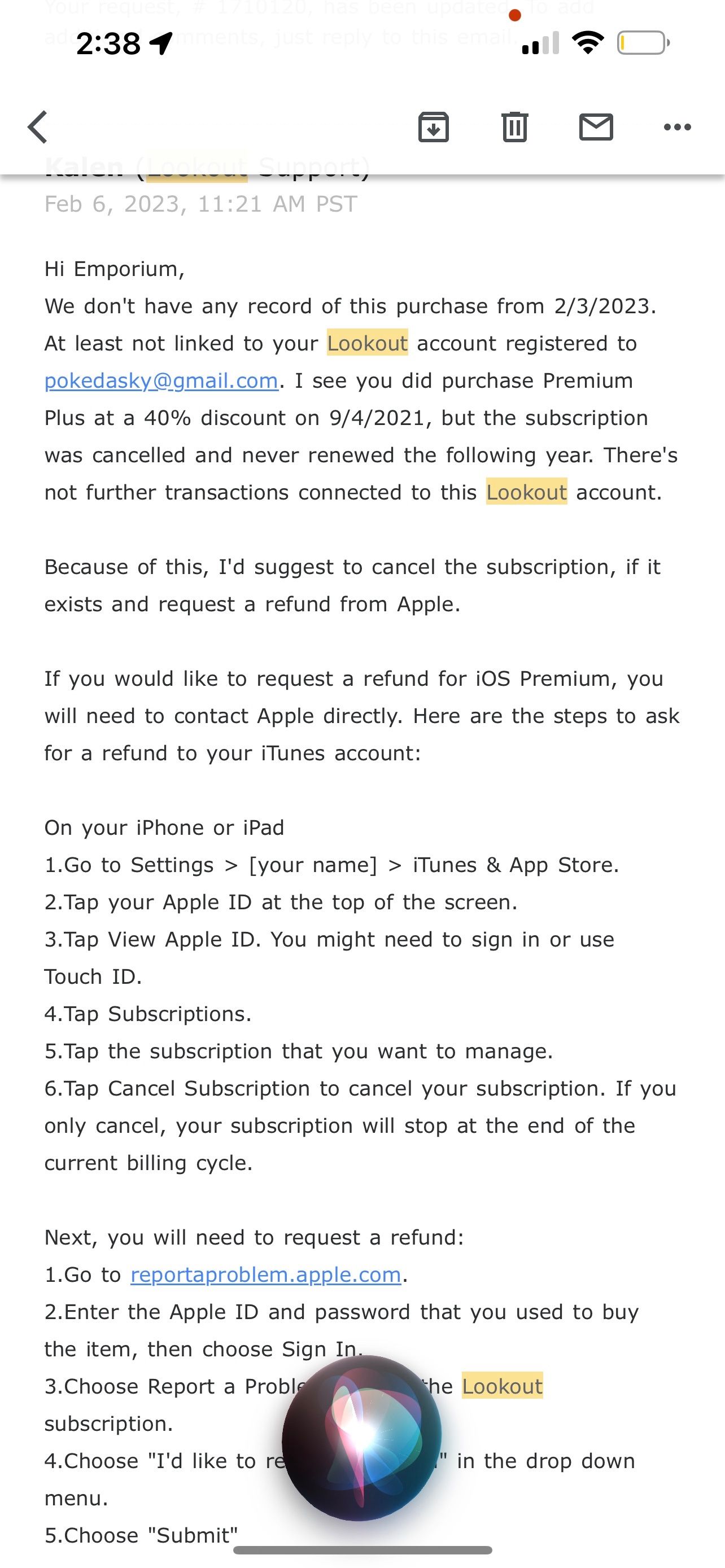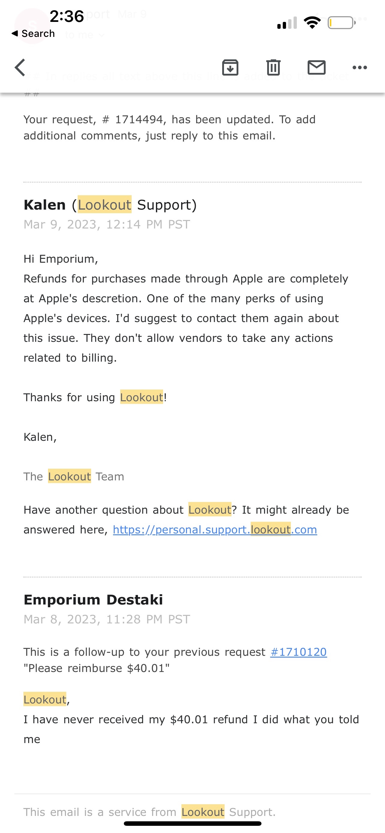 The story is I bought at priced offered in Lookout and for some random reason it charged me $99.99 instead of $59.99 when I contacted Lookout customer service they said a lot of things one of them that since I bought the annual membership through Apple that I had to go through them (understandable) and cancel the membership to then try it again, I did it and asked for the refund and everything but it did not work Apple denied my refund is rare because they usually do when I want a refund they just give it to me no questions asked, finally without other option I am reaching out to my IOS peers here to help me find a solution at this point. I just want my money back now