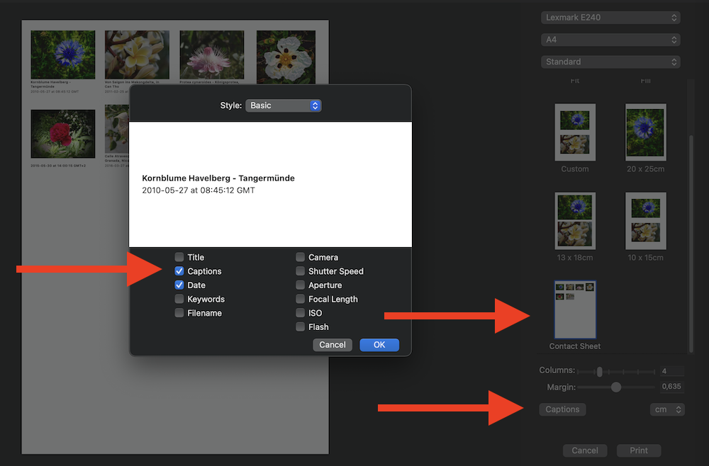 When printing a contact sheet, can I set it up so that captions are printed beneath the pictures?