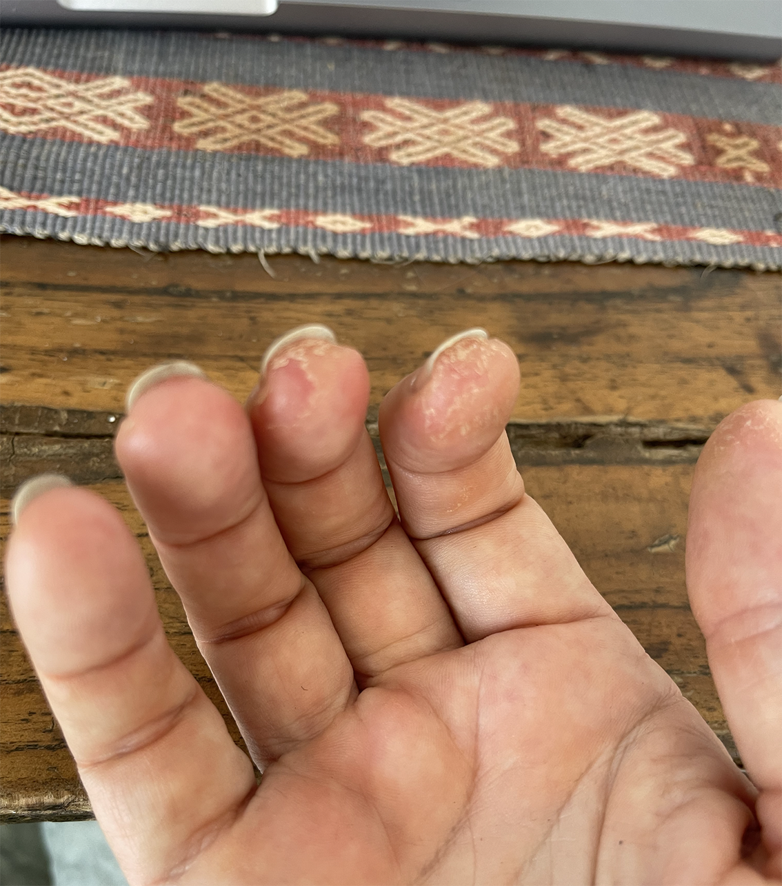 painful cracked fingertips, unable to do my job. what has any one found to fix this problem, i contacted apple care, sent them photos, have heard nothing since. You can see where the skin is so irritated, its exactly where is use my finger on my phone and track pad on the laptop