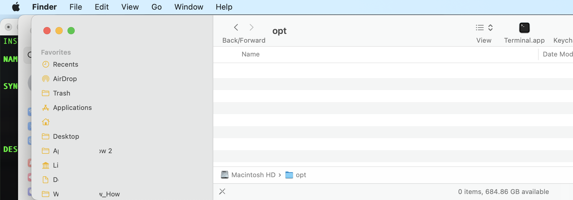 Now, if I open Finder and look under Macintosh HD I see no subdirectory named /opt.
