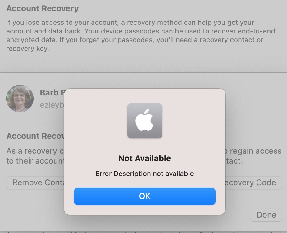 My mother got a new iPhone and a new phone number (she switched carriers). She successfully entered her new phone number into the Apple ID settings on her iPhone. The old number is no longer listed there at all. She subsequently updated her Apple ID password, and now Apple wants to send a verification code to her old phone number, which she no longer has access to. One option is to request a code from one of her trusted contacts via the Account Recovery process. I am the trusted contact for my mother. When I go into my settings to request a code for her to use, it works fine until I get to “Generate Recovery Code” for her name. Then I get a “Not Available - error description not available” message. This was supposed to be our fail-safe. Why in the world am I getting this error message?