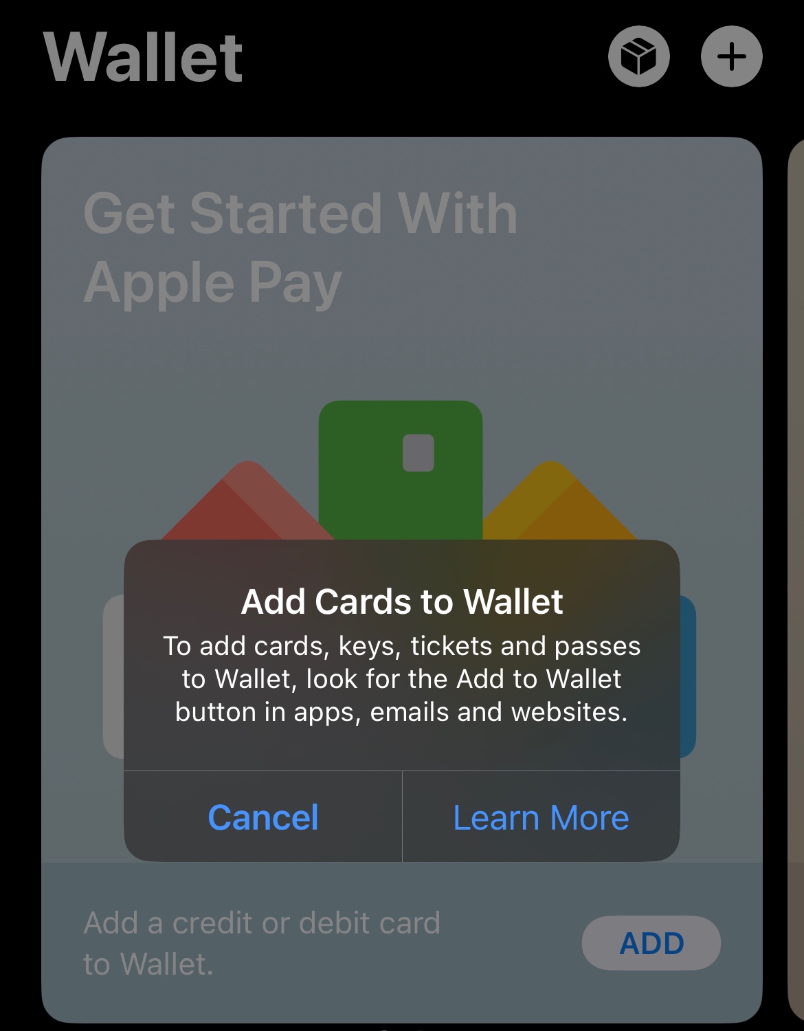 To add a credit or debit card tap the “+” in the upper right corner of the screen and follow instructions.