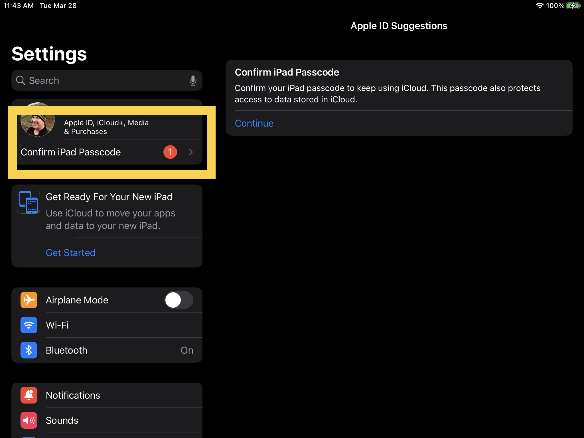 In Settings, beneath my name, I noticed a red badge next to “Confirm iPad Passcode.” Note that this is an iPad I’ve had for years, and I haven’t made any changes on it other than updating the OS occasionally.