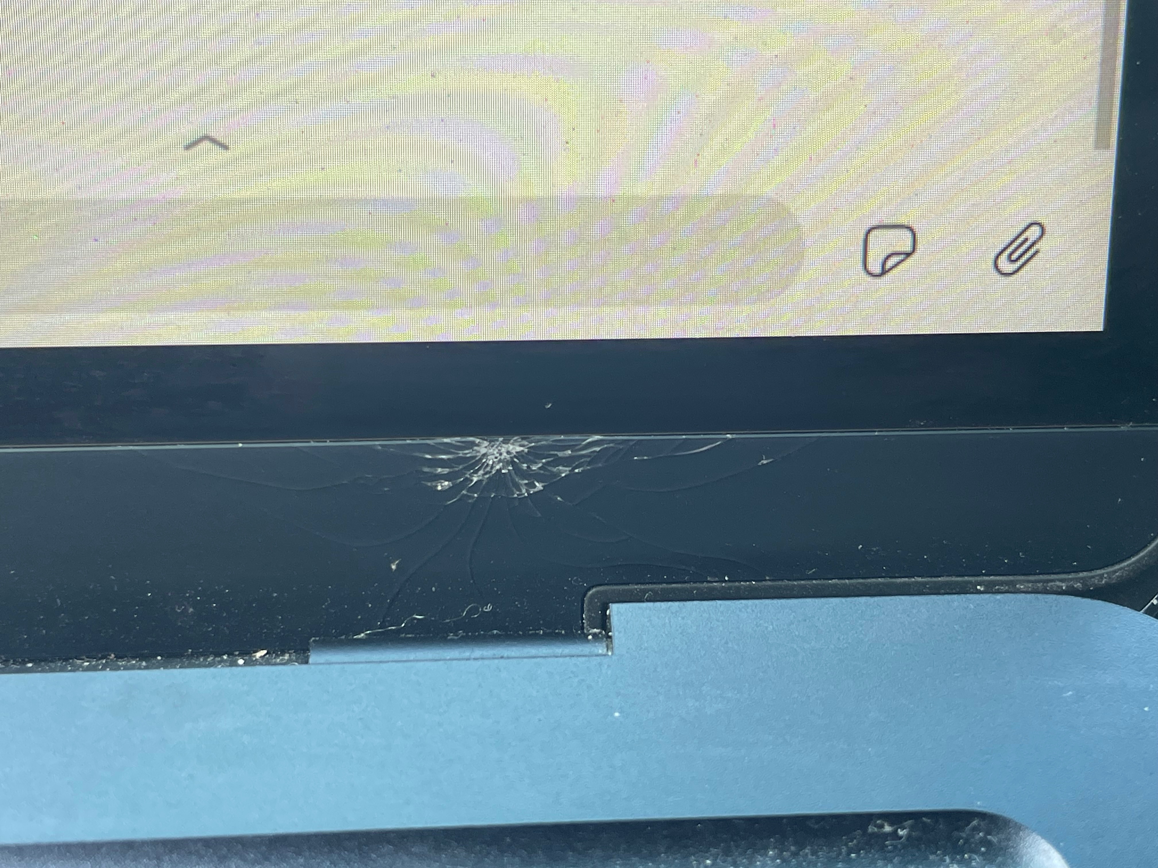 This is exactly what the crack on mine looks like! Like the hinge itself shattered the screen. And I've been googling and there doesn't appear to be any Apple endorsed screen protectors which cover that part of the bezel (the only apple endorsed screen protector is Belkin TruePrivacy™ 13" Screen Protection for MacBook Air/Pro - which doesn't cover the bezel).