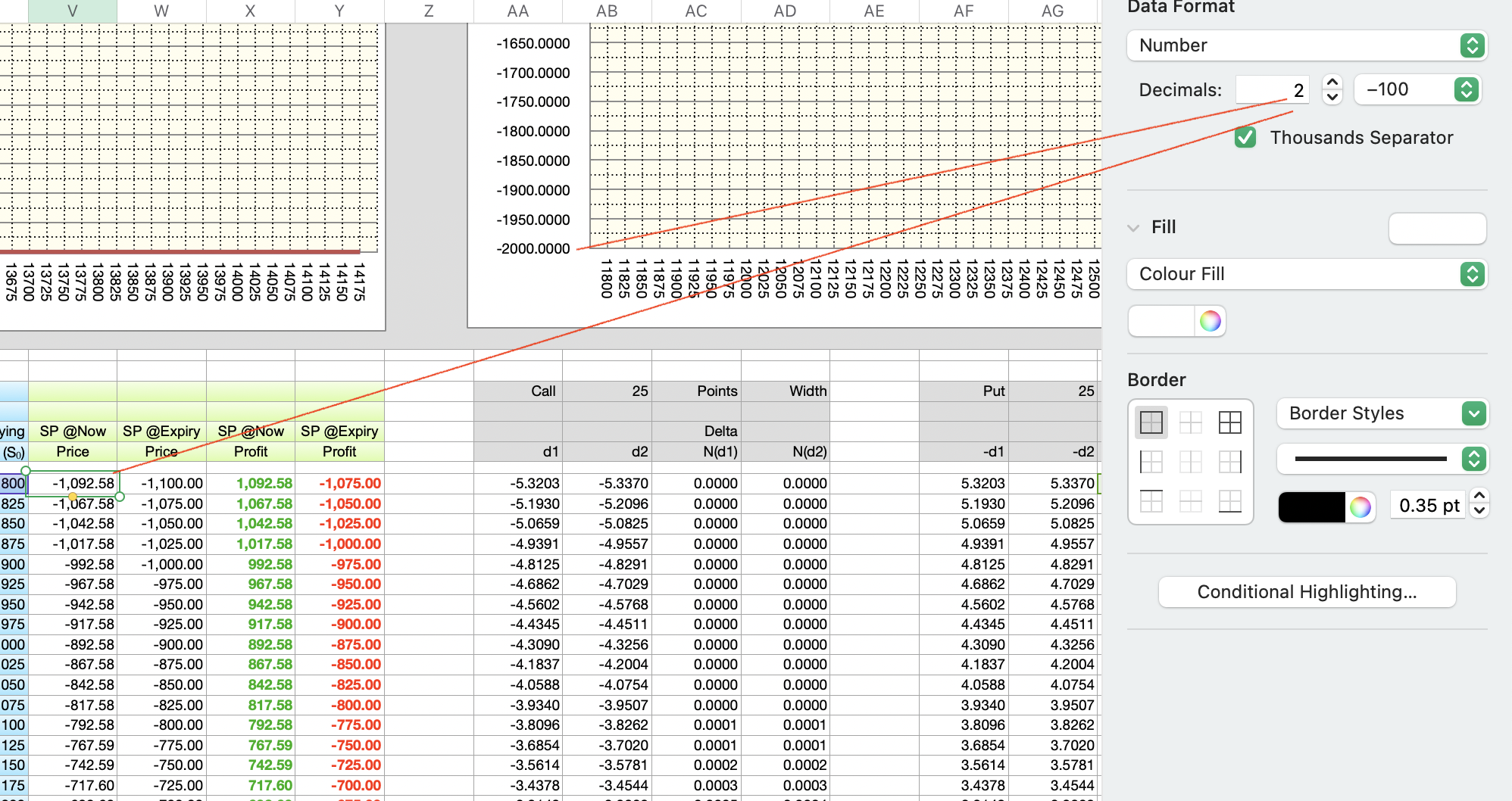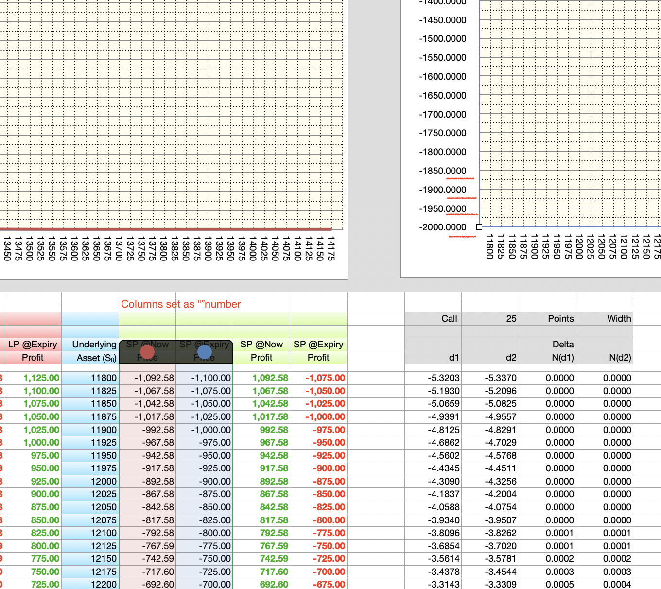 I used to have columns E and F set as “dollars” currency (which are for values that will display on the Y axis of a chart -- my red and blue lines -- but I changed E and F to a “number” format.