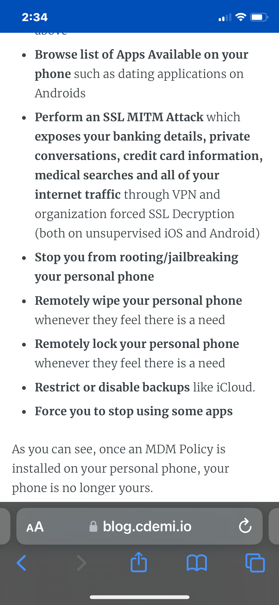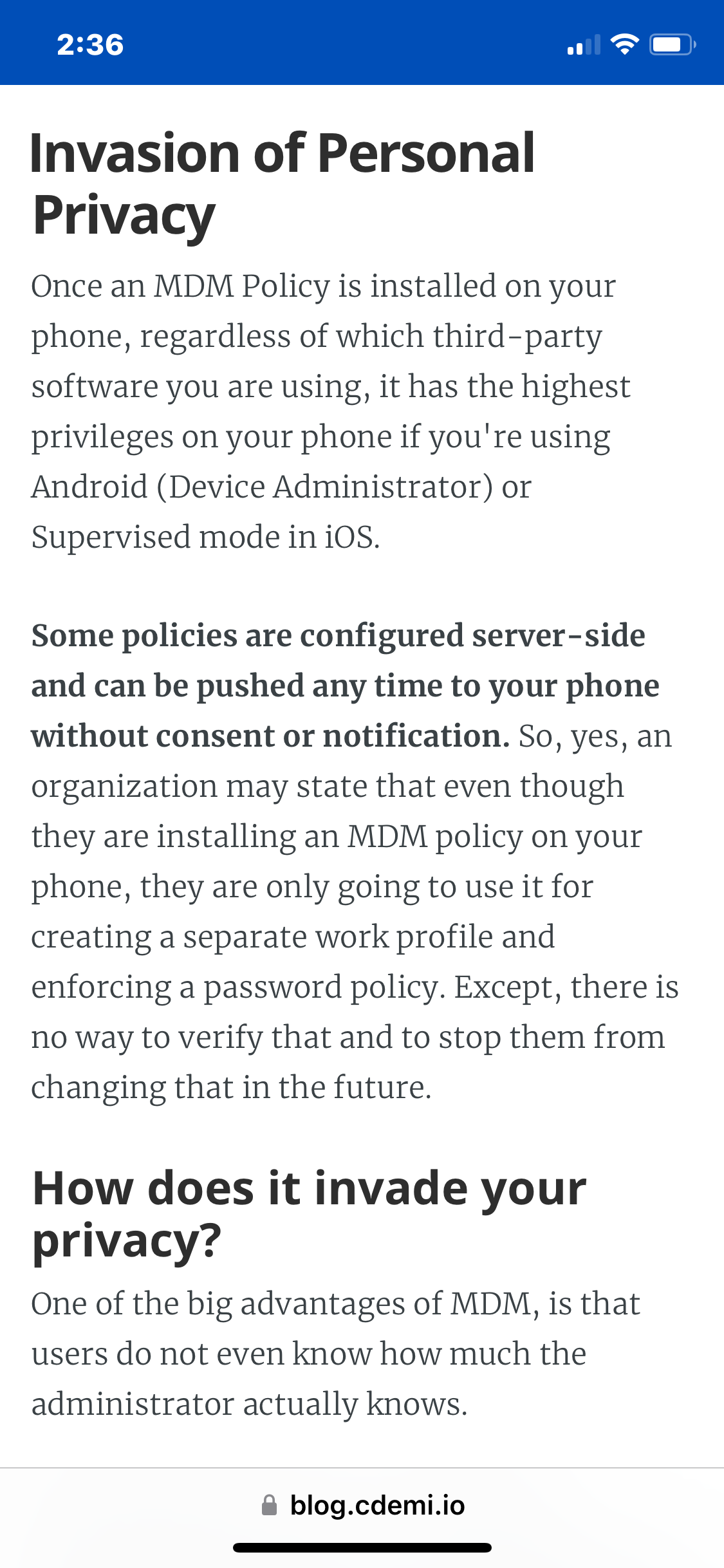 And, scan house for active devices, almost all IoT contain no security or very little, my Rokus were compromised! The data was viewable on the router. Check out Wi-Fi connections listed under Wi-Fi. There is a way to view the password on devices that have previously connected, look that up I don’t want to post here! Look for rogue managed hotspot, include that with documentation. Anything that has been brought into your home is likely compromised, even things that were not set up. Smart TVs and sound bars for TVs can be compromised. Go to a public network and look at your email and accounts, view source, I’ve found many pages of creation of a fake email “pass through” page that restricts the view source function on MDM. Keep in mind that public Wi-Fi is generally not safe. But at this point you are already compromised. The MDM uses “web clips” you may have noticed this being used under certain apps, some are valid, some are not. But the MDM does not use Safari to browse, it uses web clips! This enables site blocking, removal of tool bars, and fake pages.
