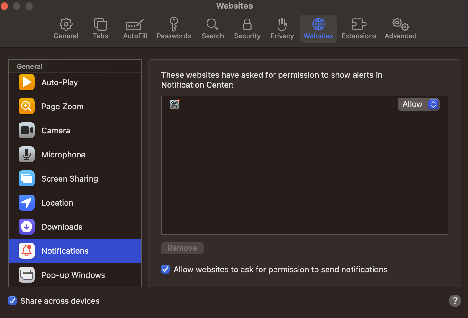 So, I searched the Internet, saw this thread, and followed your suggestions. The screen shot that My Dj Sound Lights posted was exactly what I found. I changed "Allow" to "Deny", closed the window and then checked it only to see that Deny changed back to Allow. Grr… so, I UNchecked the box "Allow websites to ask for permissions to send notifications", rechecked the preference and it stayed as "Deny." Now, the gear icon titled "Check…" is gone from the System Preferences Notifications list.