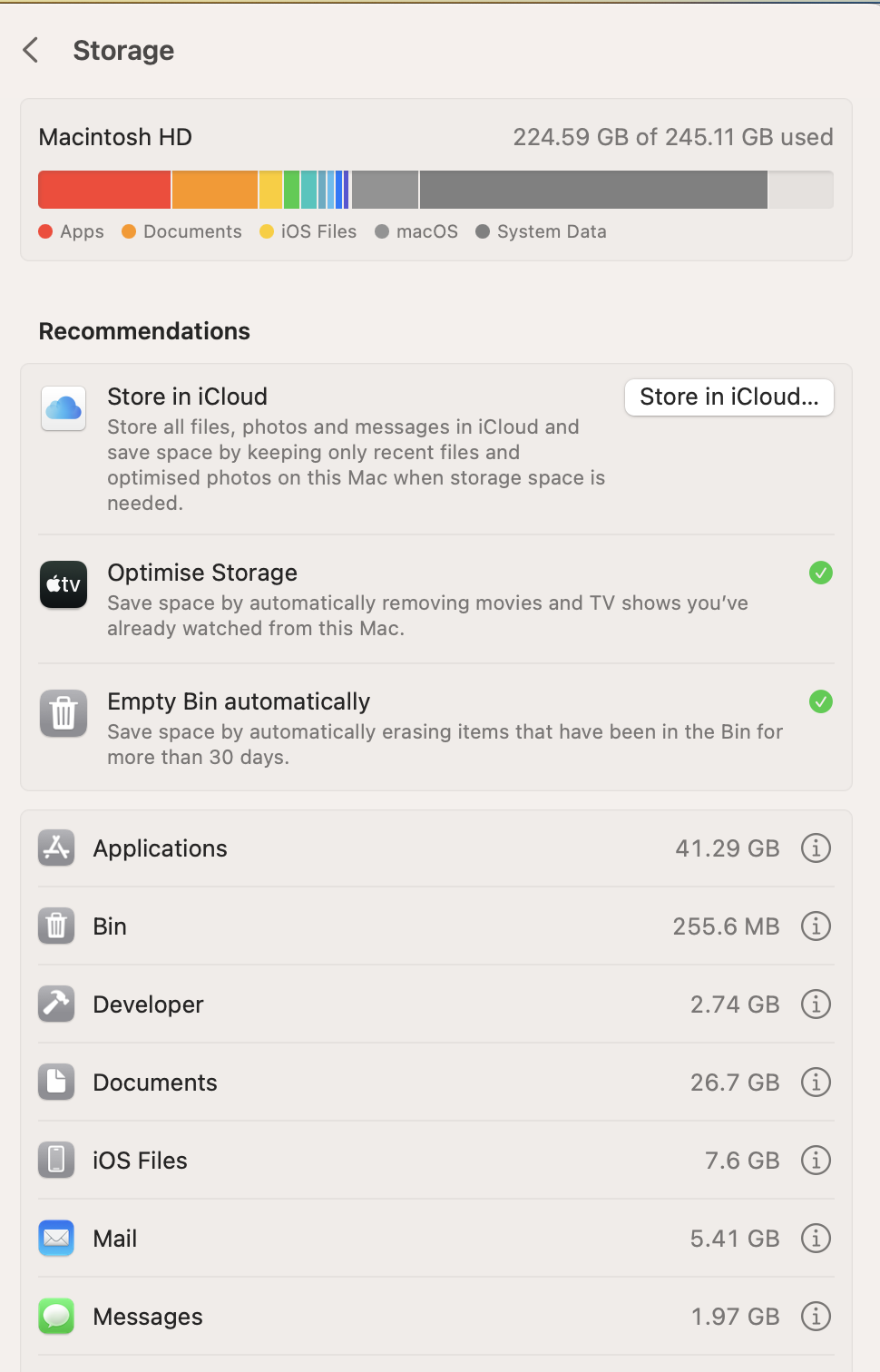 System Settings shows 225 GB - see photo attached.