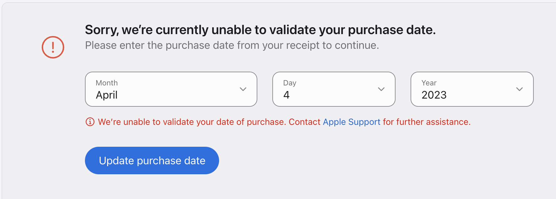 If that doesn't work and you have an iOS device, download the Apple Support app, tap on your MacBook Pro from the list of your devices and then tap "Device Details". If you don't find an option to update your purchase date these as well, contact Apple Support.