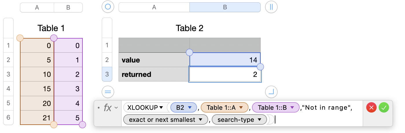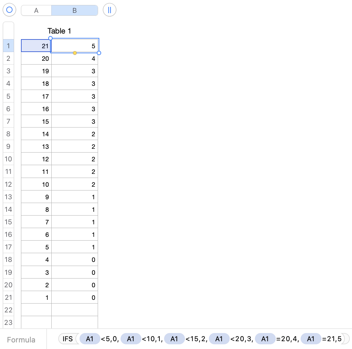 IF(A1=21, 5, IF(A1=20, 4, IF(A1<20, 3, "out of range")))