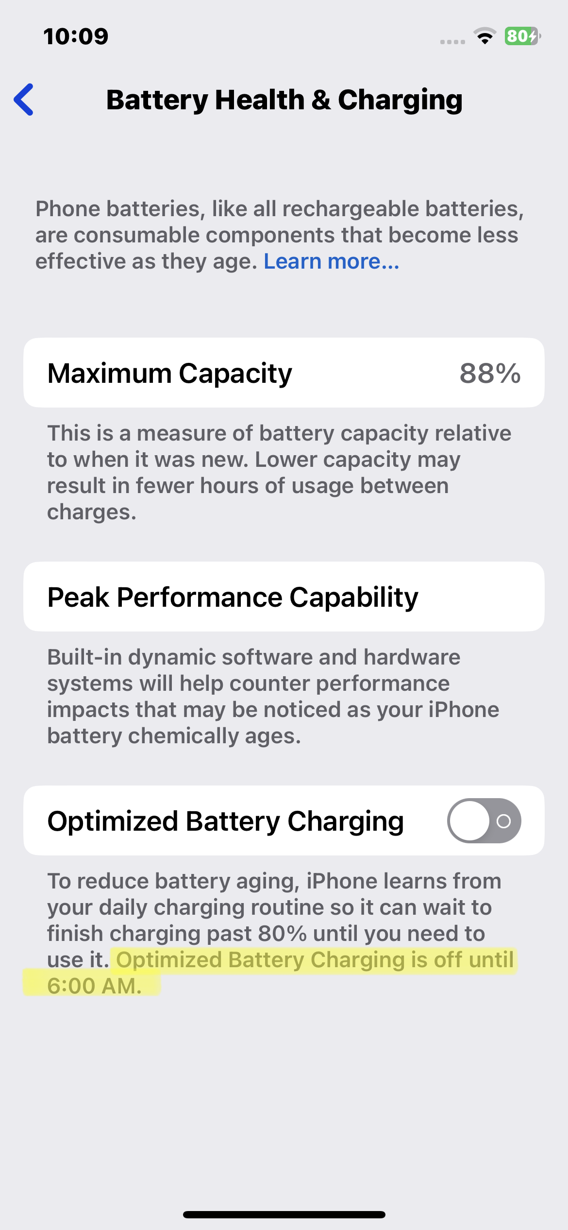 And finally, when I go to Settings to view Optimized Battery Charging, I see an extra “info sentence”, which isn’t there when the feature is permanently off, reinforcing the theory that Charge Now turns off Optimized Battery Charging only temporarily: