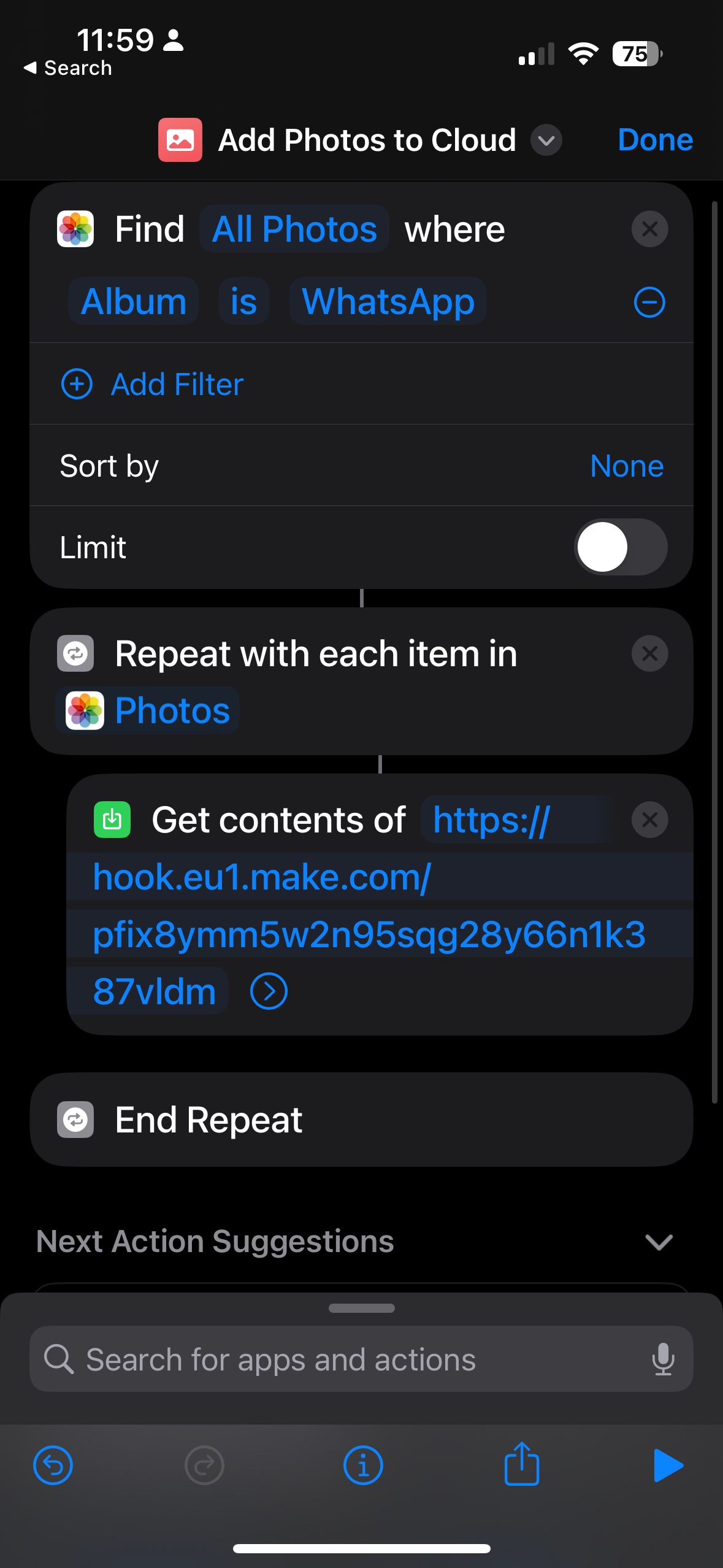 Essentially I'm trying to create an Apple Shortcut that finds all photos within an album and sends them to a webhook. The webhook, through a third-party low-code provider, uploads the photos to a Cloud Storage provider, and then delete the above photos (so that the same photos won't be re-uploaded in the future).