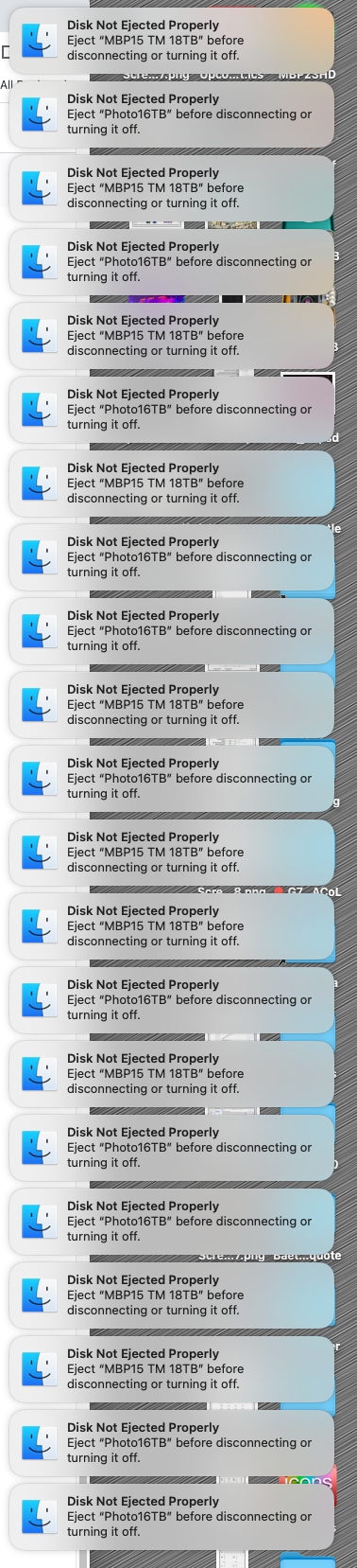I've got a combo of 8 drives - HDD and SSD - attached to a USB3 Anker hub and connected to my 16" M1 MBP via USBA3/USBC cable. I had no problems while running Monterrey, ever. I recently switched to Ventura 13.5.2 and have been getting the "Disk not Ejected Properly" error ever since. It is rather unpredictable in that sometimes the error applies to all external drives, sometimes just some of the drives, but almost always the Crucial X6 when opening the laptop / waking from sleep. And like the OP, often the message is repeated, although only a few times. Oddly, I also sometimes get the error message after waking even though the drives were intentionally ejected before sleep.