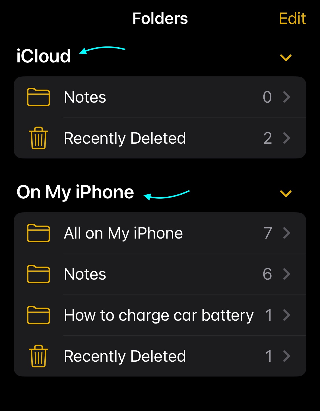Then you have the next folder "On my iPhone" which is exactly what it says, all notes written on there are saved on your phone only.
