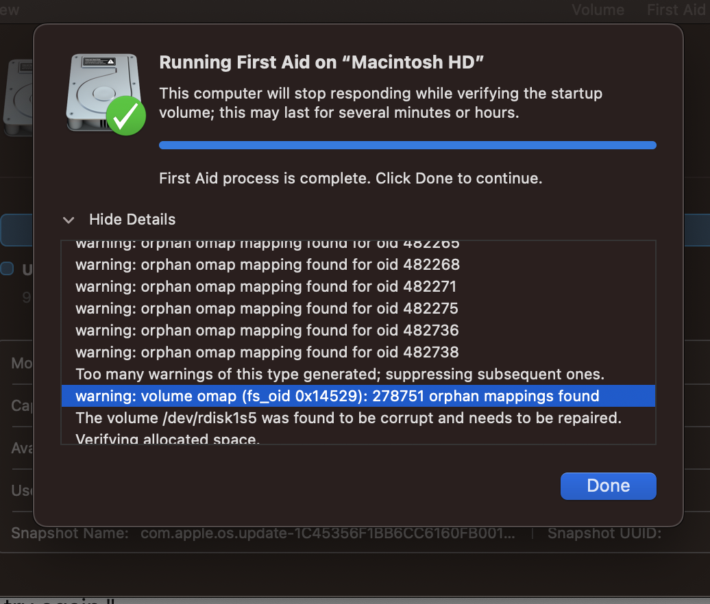 Try running First Aid while booted into Recovery Mode. Make sure to run First Aid on the hidden Container. Within Disk Utility you may need to click "View" and select "Show All Devices" before the hidden Container appears on the left pane of Disk Utility. If First Aid cannot repair "Errors" from Recovery Mode, then you will need to erase the whole physical SSD (Intel only) before reinstalling macOS & restoring from a backup.