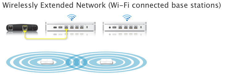 This is the typical setup with access points and Routers using 'over-the-air' connection between devices. You can see that a portion of the bandwidth in your network neighborhood will be consumed by access point to Router traffic, whether that is on the same channel or a different channel.