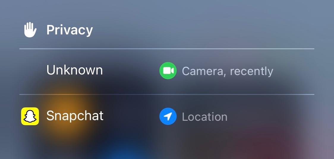 "Unknown app using camera: Is it just me that gets those “privacy” things on the control centre where it says 'uknown, recent' and its using camera?? [...]It's kinda scary and it's the 4th time i see this… tho it's almost always after using snapchat. Is it snapchat or someone using my camera? But whenever i go to snapchat and look up here privacy it shows “snapchat” using camera so idk…"
