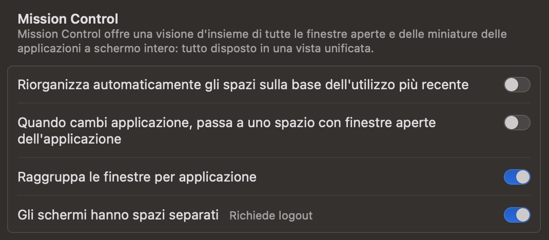 BUT: i loved the first version, when you opened mission control and it showed all the spaces, so i could see it all at first glance, and i hated when Apple introduced that new version that hides the spaces, and you have to go on the area with the pointer to fully visualize the content of the spaces. Nothing to die for, but i surely would reactivate the good old "show all" mode if i could. I searched in the settings but without success.