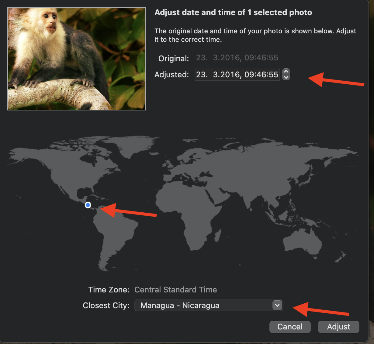 All photos you have selected together will be adjusted by the same offset of the time. This way you can correct the date of photos, where he clock in the camera has been set incorrectly.