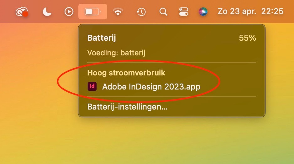 Since a month or so the battery of my Macbook 14inch 2021 suddenly drains much faster. At the moment my battery is already around 30% after 3-4 hours, which was not the case before. When I click on my battery it says "high power consumption" and points to InDesign (see image), even though my InDesign app is not open. I do not know if this might be the problem, but it always mentions InDesign even when I am not using the app. Does somebody know how to get rid off this? Or what else might be the problem?