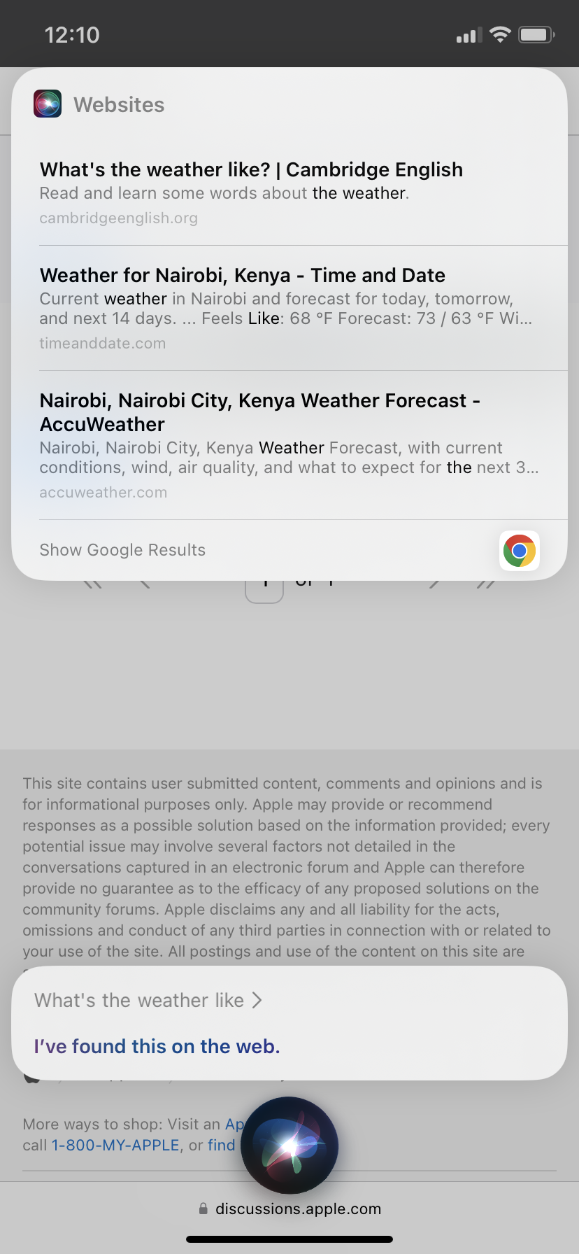 Hey Siri, "What's the weather?" Siri replies, "I found this on the web."