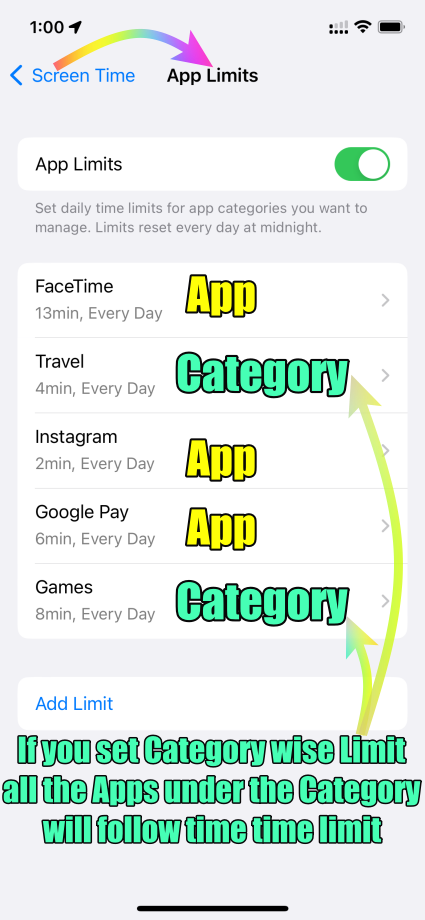 I am not clear on how you set the time limit. Did you set a limit for an App for or for categories?