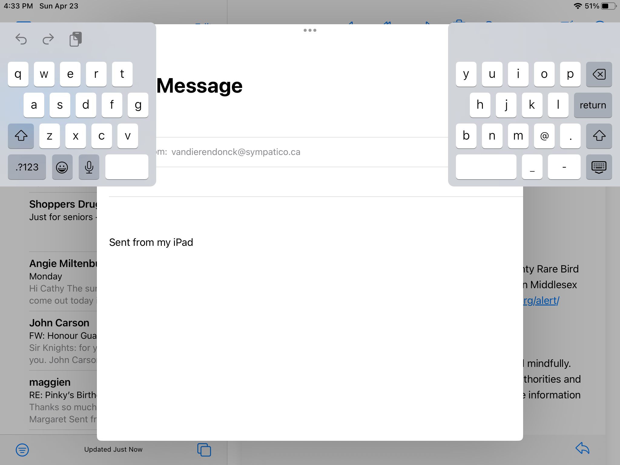 "iPad displays split keyboard in Mail: How do I remove in Mail a split keyboard screen on an attempt to write an email. See attached image"