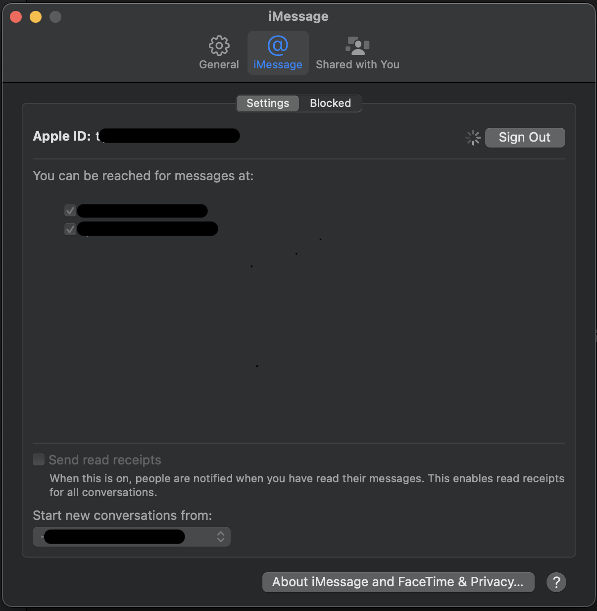 I can only set it up with my phone number, but then I can't link iMessage with my MacBook. When I open iMessage on my MacBook and go to settings, the Apple ID email Is listed there, as well as the phone number, but they are greyed out and I can't do anything with them. Next to the Sign Out button there is a spinning cog wheel, but it never finishes.
