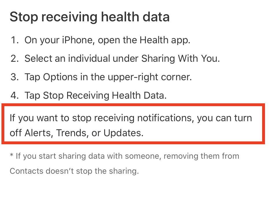 What we want is to not be notified that we are sharing health data with others. We know we are sharing. We don’t need to be reminded every few days. There doesn’t appear to be any notification setting related to being reminded that you’re sharing health data with another person. Sure, I could turn off all notifications from Health, but then I wouldn’t get all the other Health notifications that I do want.