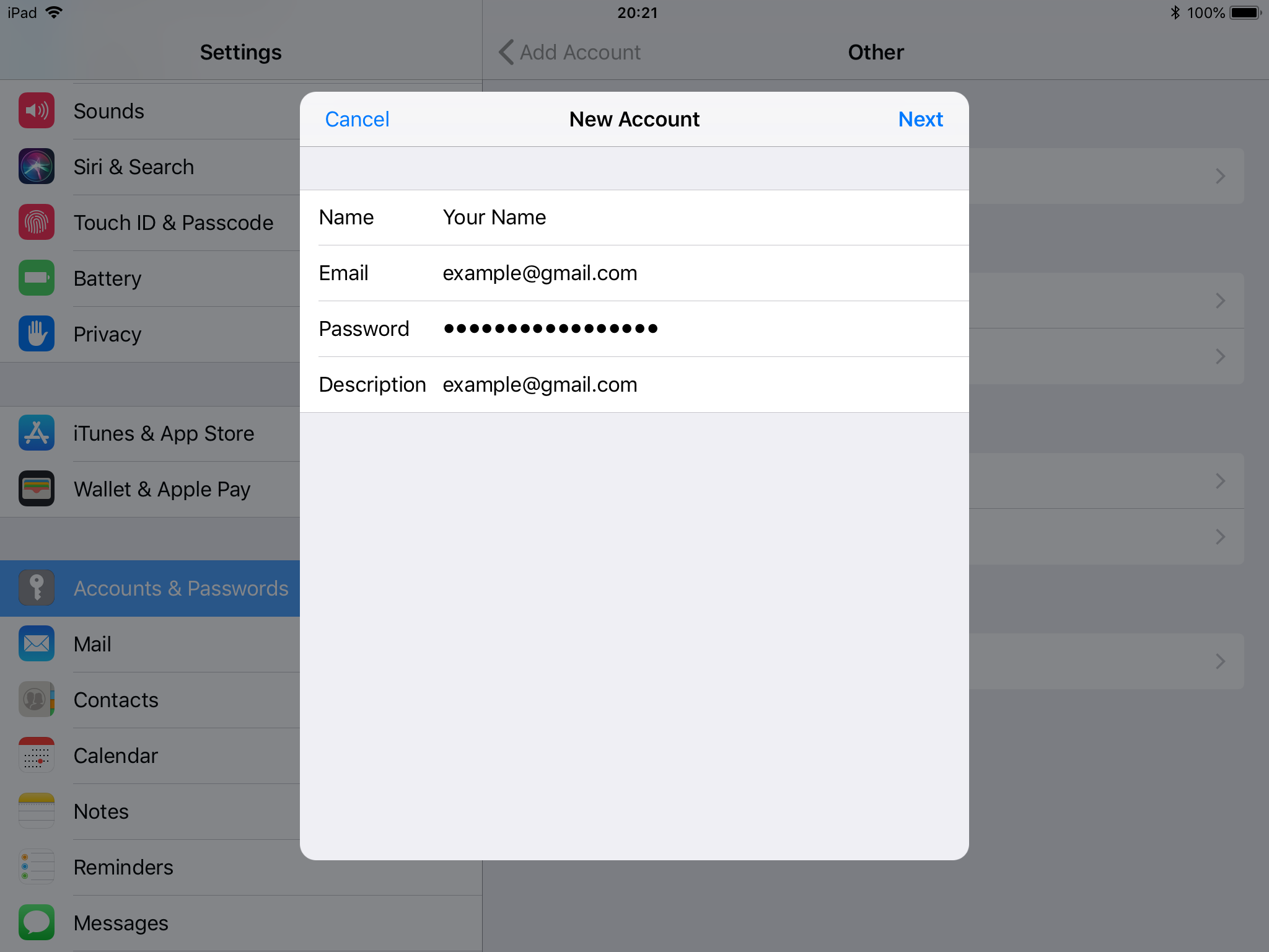 2. Fill in your information (see screenshots), but instead of putting in your regular password, put in the new Google app password. Note that the username and password is required both for the IMAP server (incoming mail) and SMTP server (outgoing mail)