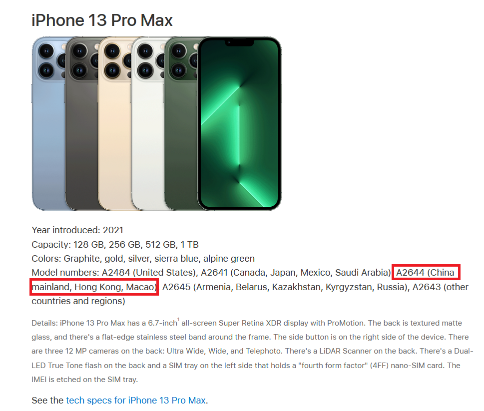 "Model numbers: A2161 (Canada, United States), A2220 (China mainland, Hong Kong, Macao), A2218 (other countries and regions)"