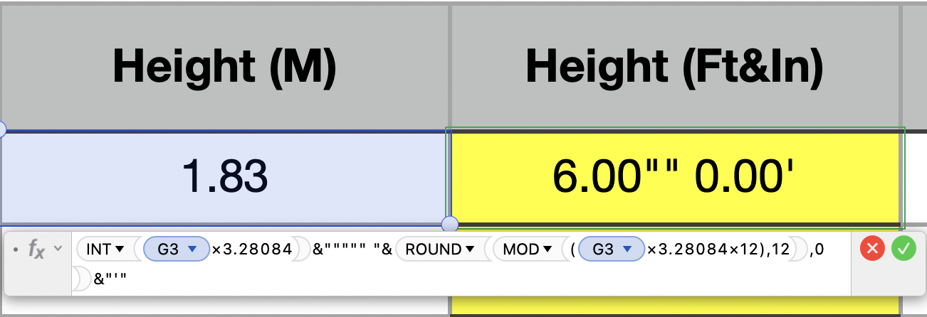=TEXTBEFORE(INT(G3×3.28084),".")&"' "&TEXTBEFORE(ROUND(MOD((G3×3.28084×12),12),0),".")&""""